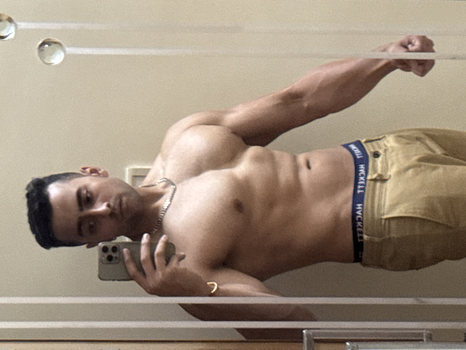 A man with a muscular physique poses shirtless, wearing tan pants with a "HVCKELL" branded waistband. He is holding a smartphone, presumably taking a mirror selfie. He has dark hair, a silver chain around his neck, and a gold ring on his right hand. The reflection reveals a bathroom setting with a tiled wall and glass light fixtures.
