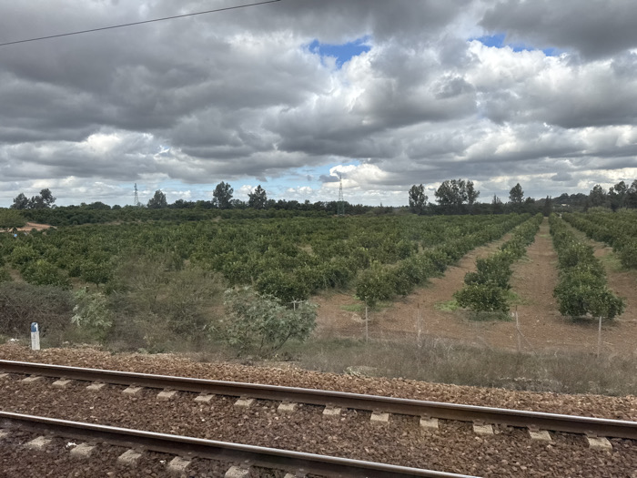 This image, captured in Sidi Yahya El Gharb, Morocco, presents a static outdoor scene dominated by an agricultural landscape. In the immediate foreground, two parallel train tracks are visible, laid upon a bed of brown ballast. To the left of the tracks, a short white marker post stands upright. Beyond the tracks, the midground is occupied by an extensive orchard, characterized by numerous uniform green trees, likely citrus, planted in distinct, organized rows extending towards the horizon. The soil between the tree rows appears dry and reddish-brown. Scattered wilder shrubs and smaller trees grow closer to the train tracks. In the background, a cluster of taller, darker green trees forms a dense line. A tall, slender utility pole, likely a power line tower, is discernible against the sky in the mid-distance on the left side, with overhead lines faintly visible. The sky above is largely covered by dense, grey cumulus clouds, with intermittent patches of blue sky visible through breaks in the cloud cover, particularly towards the right side of the frame. No individuals or active subjects are present within the scene.