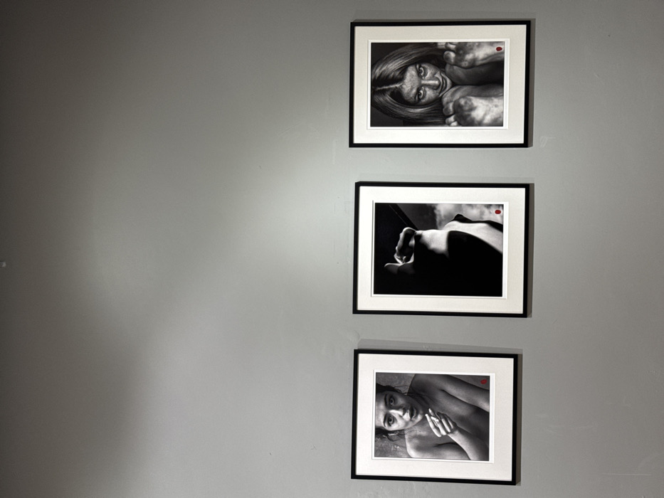 Three identically framed black and white photographs are displayed horizontally on a plain, light grey wall in Lviv, Ukraine. Each photograph features a small, solid red circular mark near the bottom center of the white matting. The leftmost photograph depicts a bare-chested young woman with dark hair, looking directly forward with an open mouth, a lit cigarette held between the fingers of her right hand near her lips. The central photograph is a close-up, upward-angled shot focusing on a person's neck and chin, with the face mostly obscured by shadow. A hand or fingers are visible towards the top right of the frame, against a subtly textured, possibly cloudy, background. The rightmost photograph shows a young woman with lighter-colored hair and an intense gaze, looking directly at the viewer. Her hands, appearing soiled or textured, are positioned close to her chest or neck, suggesting a crouched or leaning posture.