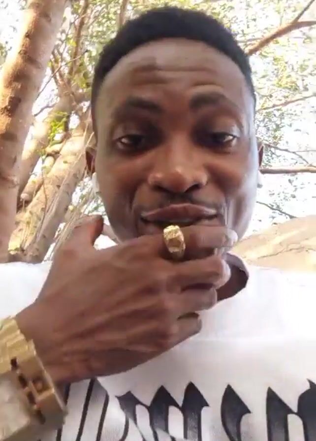 A man is recording a close-up video of himself outside under a tree. He is wearing a white shirt with a black and blue graphic print, a large gold watch, and a gold ring. He has dark, short hair and a mustache. He places his hand on his chin and then brings it down in front of his mouth. His mouth moves as he speaks to the camera. The background includes the tree and a cement wall.