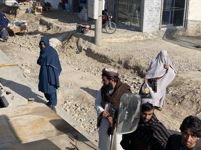 This image depicts a daytime street scene in Gundigan Village, Afghanistan, characterized by a mix of unpaved ground, concrete structures, and individuals