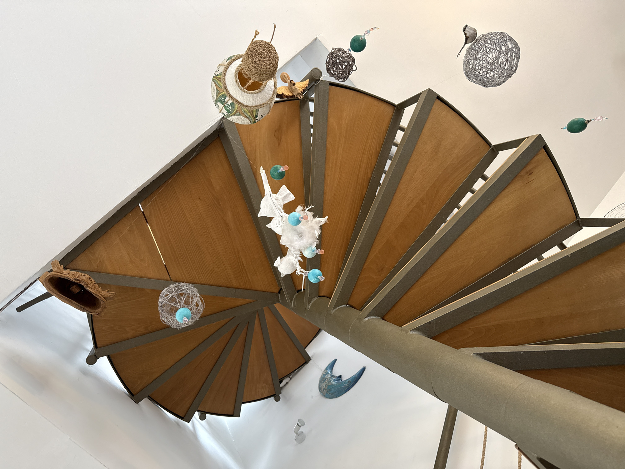low-angle shot of a spiral staircase against a white wall. The steps are made of wood and the railing is gray. Various decorative items hang from the staircase. These include woven baskets, string balls (some with small bird figures attached), paper birds with cotton fluff, and a blue crescent moon decoration. No people are visible in the image. The location of the photo is not apparent from the image, so any connection to the city of Zelenika, Montenegro is not determinable from the visual information.