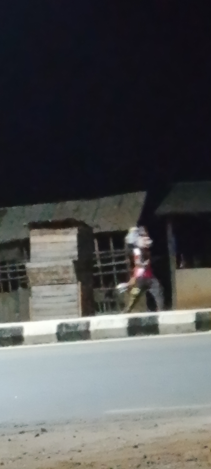 The image depicts a low-light, blurry scene at night in Zango-ndaji, Nigeria. The foreground shows a dirt shoulder transitioning to a paved road with a distinct black and white striped curb. In the background, behind the curb, are several rudimentary structures. One structure on the left features a facade of stacked wooden planks, while adjacent to it is another structure with a gridded opening, resembling a barred window. Further to the right, a darker, possibly open structure is visible. A single individual stands near the structures, to the right of the wooden facade. This person appears to be wearing a light-colored top, possibly with a red component, and dark trousers. They are holding an elongated object or two distinct items in their hands, extended forward or to their side. Their specific actions and interactions are obscured by the low light and blur. The environment suggests an urban or semi-urban roadside area.