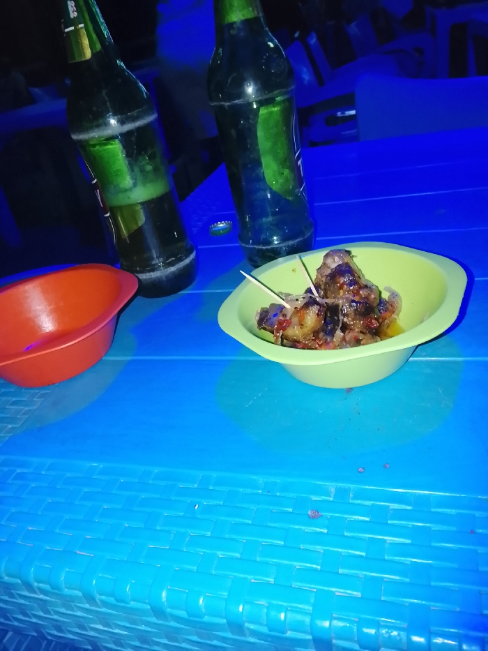 A close-up, low-light image captures a blue, plastic-woven table surface. Two green glass bottles are present: one on the left is partially full with a foamy liquid, the other on the right is nearly empty. A green bottle cap lies near the empty bottle. An empty orange plastic bowl is on the left. A lime-green plastic bowl on the right contains several dark-colored food pieces, possibly grilled meat or fish, each impaled with a small wooden toothpick, mixed with chopped red and white vegetables and a glistening sauce. The scene is illuminated by dim, blue-tinted artificial light, suggesting an indoor or outdoor nighttime setting at a casual establishment in the city of Unknown, Unknown. No individuals are visible.