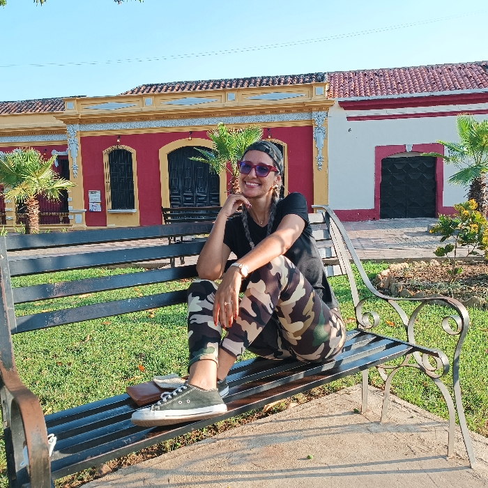 A woman sits on a park bench, one leg extended with a sneaker-clad foot resting on the slats. She wears camouflage pants, a black top, and sunglasses. Her hair is in braids, covered by a bandana. Behind her, colorful colonial buildings stand, one painted red and yellow, the other white and red. Palm trees flank the buildings. A second bench sits in the background, and the scene is bathed in bright daylight.