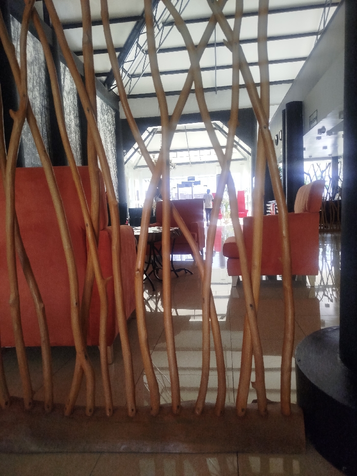 This image depicts an interior view of a contemporary hotel lobby or lounge area in Nairobi, Kenya. In the immediate foreground, a decorative partition crafted from numerous irregularly shaped, slender, light-brown natural wood branches stands vertically, rooted in a thick horizontal wooden base. The floor is covered with large, reflective, light-toned tiles. Through the gaps in the wooden screen, several oversized, orange-red upholstered armchairs and sofas are visible, arranged in seating groups with dark-colored tables featuring intricate bases positioned between them. The background reveals a high, gabled white ceiling with dark structural beams and a brightly lit glass entrance area. One individual, dressed in a white shirt and dark trousers, is observed walking away from the viewer towards the left within the illuminated entrance. A second, indistinct figure is partially visible further to the right near a reception-like counter, adjacent to a large, dark cylindrical column. A sign partially reading "Push" is visible above another sign displaying "Point" or "Paint" on a dark vertical surface.