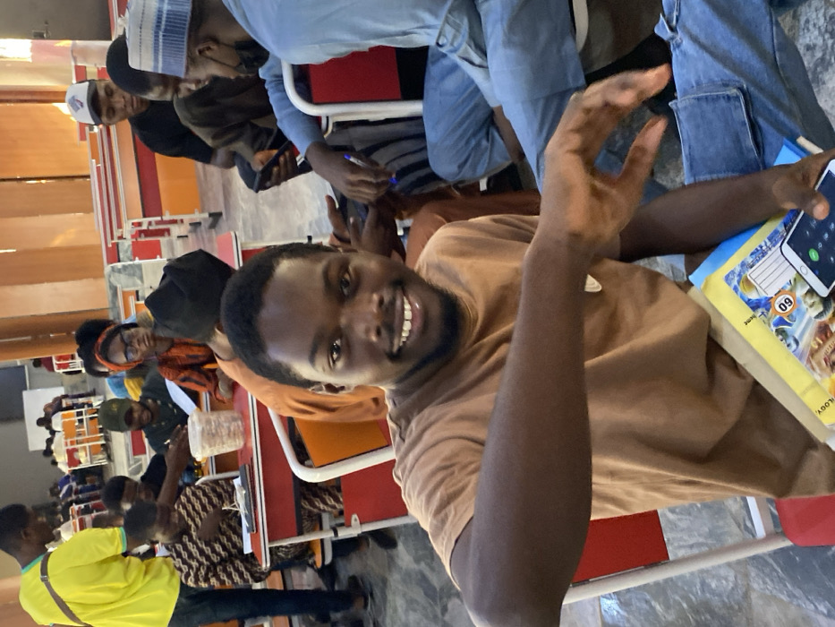 An indoor scene within a classroom or lecture hall in Minna, Nigeria, shows multiple individuals, predominantly young Black males, engaged in various activities