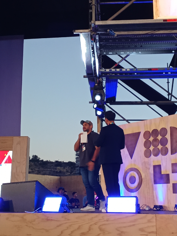 Two men stand on a wooden stage. The man on the left, wearing a baseball cap and a gray shirt, holds a white card. The man on the right wears a dark suit. Stage lights shine in front of them. The backdrop behind them includes blue circles and geometric shapes. Overhead, scaffolding and lighting equipment are visible. In the distance, there is a low, undulating landscape.