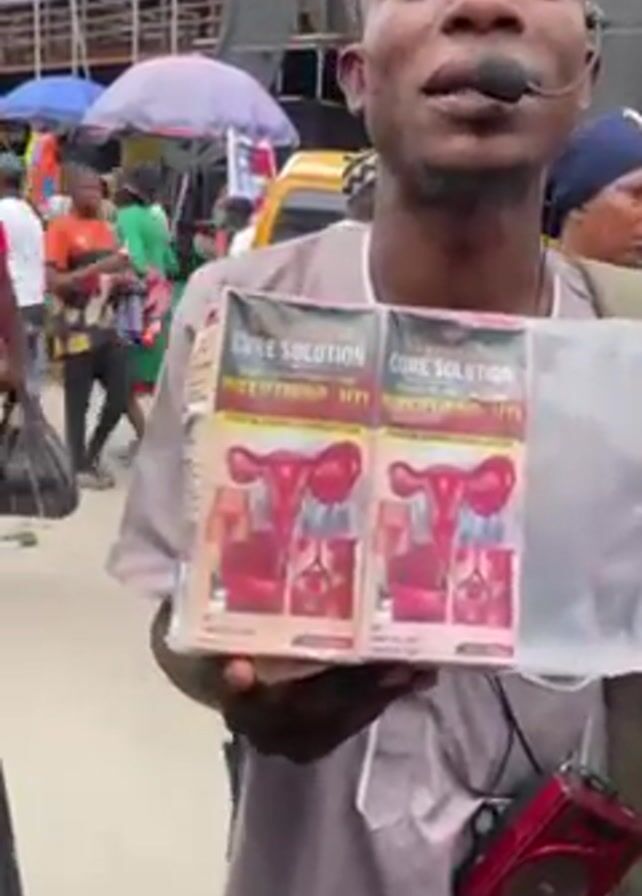 A man wearing a light purple tunic, a white cap, and a backpack stands in a crowded outdoor market. He is holding two boxes of a product labeled "CURE SOLUTION," which claims to treat Infections and UTIs. He is speaking into a microphone attached to his shirt. A small red radio is also attached to his shirt. People are walking around in the background. There are market stalls with umbrellas and a yellow taxi.