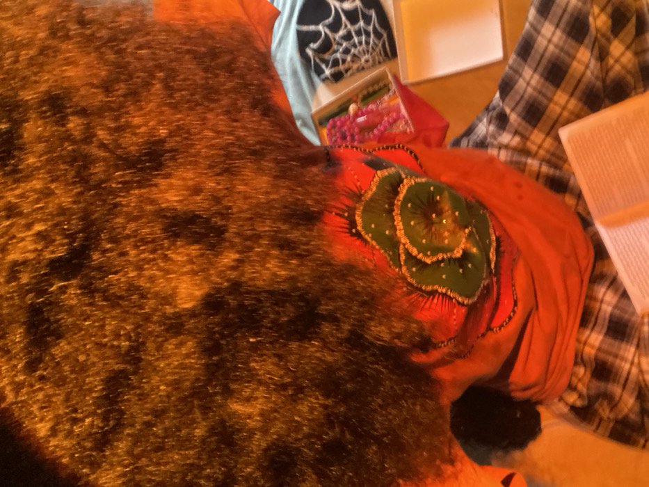 A large furry, brown cat dominates the left half of the image. An orange garment with a green rosette adorns its back. A partially visible plaid blanket and open book appear on the right. Adjacent to the cat, behind the orange garment, are a box of colorful beads and a container with a spiderweb design. The scene is dimly lit with warm-toned lighting.