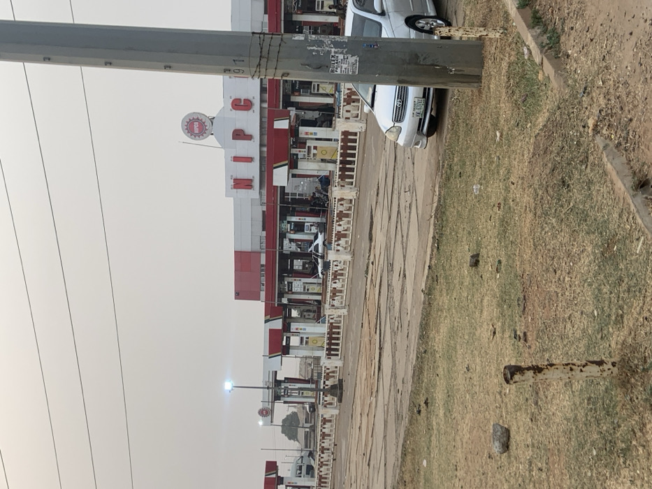 A gas station displays the "NNPC" sign prominently. Red and white awnings cover the pumps. Cars are seen near the station. The sky is pale, suggesting either early morning or late evening light. Power lines stretch across the sky. A paved road with a patterned surface runs alongside the gas station, and dry grass borders it. A light pole is positioned along the road.