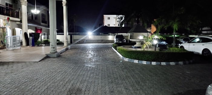 Paved driveway at night, flanked by pillars and a building to the left. To the right, a circular hedge surrounds a fountain with a lamp. Parked cars are visible. The lighting is poor but adequate to illuminate the space, including a building in the background with multiple windows.