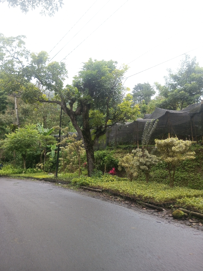 The image depicts a roadside scene in Eheliyagoda, Sri Lanka, under an overcast sky. The foreground features a dark grey asphalt road, appearing damp, extending from the lower left to the lower right of the frame, with minor debris along its edge. To the immediate right of the road, a narrow strip of low-lying green and yellowish-green foliage borders an inclined area. This incline hosts a variety of plants, including several small, manicured shrubs with variegated leaves (light green and yellow-white) and a single prominent red-pink flowering plant towards the center-right. Further up the slope, a large section of black mesh netting, consistent with a shade net structure for cultivation, is visible, covering a significant portion of the hillside. In the mid-ground on the left, a large tree with a thick, gnarled, dark brown trunk and dense green foliage stands prominently. A black utility pole is partially visible behind this tree. Further left, taller, denser green trees, including some with broad banana-like leaves, form a thick canopy. The background on the right, behind the shade netting, shows additional tall green trees, some with a conical shape. The upper third of the image is dominated by a bright, uniformly overcast sky. Multiple thin, dark utility wires stretch horizontally across the sky, extending from the left side of the frame towards the right. No people or animals are present in the scene, and no specific actions or interactions are depicted.