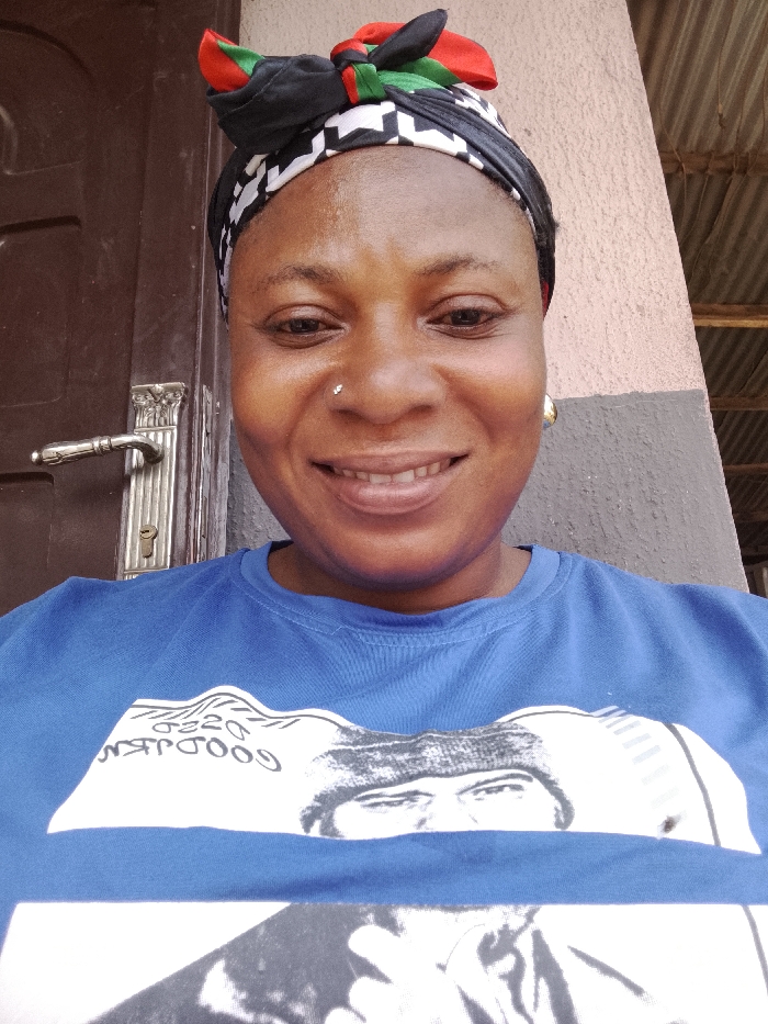 A close-up portrait depicts an adult female positioned in front of a building facade in the city of Unknown, Unknown. She has a medium brown complexion, dark eyes, and a small silver stud piercing in her left nostril. Her dark hair is mostly covered by a black and white patterned fabric head wrap, tied at the top with visible red and green fabric accents. She wears a blue crew-neck t-shirt featuring a white graphic print of a person's face, partially obscured, wearing a dark cap, with inverted text "GOODDJEN" visible above the image. A single gold-colored hoop earring is present in her right ear. She is smiling, showing her teeth, and looking directly towards the viewer. The background on the left shows a dark brown wooden door with an ornate metallic handle and keyhole. On the right, a wall is visible, painted with an upper section of light beige and a lower section of dark grey, topped by a partially visible corrugated metal roof structure.