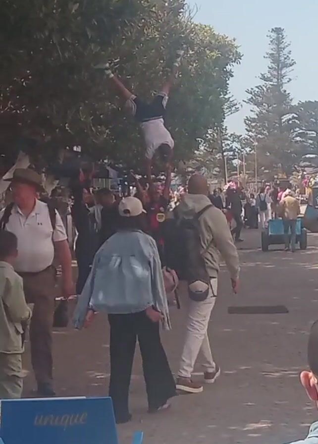 The scene depicts two men performing acrobatics in a crowded public space. One man stands on the ground while the other is held upside down in the air with his feet pointed towards the sky. The man on the ground holds the airborne man in place as he attempts various acrobatic poses. The surrounding environment is a bustling area with trees, vendors, and pedestrians of diverse ages and backgrounds. Some onlookers pause to observe the acrobatic performance, while others continue on their way.