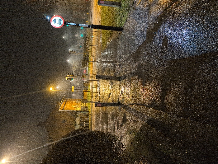 A nighttime view of a street during heavy rain. Streetlights illuminate the wet asphalt and greenery. A no-entry road sign is visible atop a pole, with other traffic lights further down the street. Fences run along the side of the road, and a building is visible in the distance, glowing from interior lights. The overall atmosphere is dark and drenched, reflecting the light off the slick surfaces.