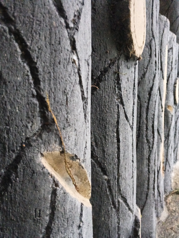 A close-up shot depicts several dark gray, artificial tree trunks arranged in a row. Each trunk features textured bark with carved lines simulating branches or splits. Some trunks have circular, beige-colored sections reminiscent of sawed-off limbs, adding to the realistic yet artificial appearance. The trunks recede into the distance, creating a sense of depth, while the rough texture and dark color dominate the foreground.