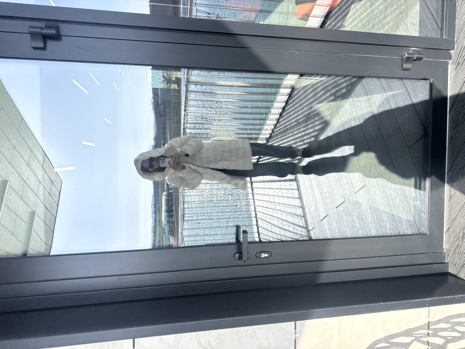 An individual is captured in a selfie reflection through a closed, dark-framed glass door, standing on a balcony in Зеленогорское сельское поселение, Ukraine