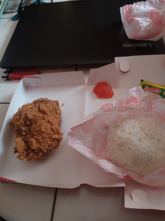 A high-angle forensic shot captures a prepared meal set on a light-colored tiled surface with dark grout lines, against a backdrop featuring a black Lenovo laptop. The main subjects are food items contained within white cardboard takeaway boxes. In the foreground and left box, a single piece of breaded, golden-brown fried chicken is prominently displayed. To its right, in a separate section of the takeaway box, a dollop of thick, bright red sauce or condiment is present. Further right, a portion of white cooked rice is encased within a clear plastic bag, which is itself wrapped in a white paper bag featuring red graphic branding. A small, partially visible sachet with green and yellow accents, possibly containing an additional sauce or seasoning, rests near the rice. In the background, positioned on a surface behind the food boxes, a closed black Lenovo laptop is visible. To the left of the laptop, a red translucent disposable lighter is placed on the same surface. A crumpled white paper bag with red branding, similar to the one holding the rice, lies on top of the closed laptop. The scene depicts a casual dining setup. The location is Unknown, Unknown.