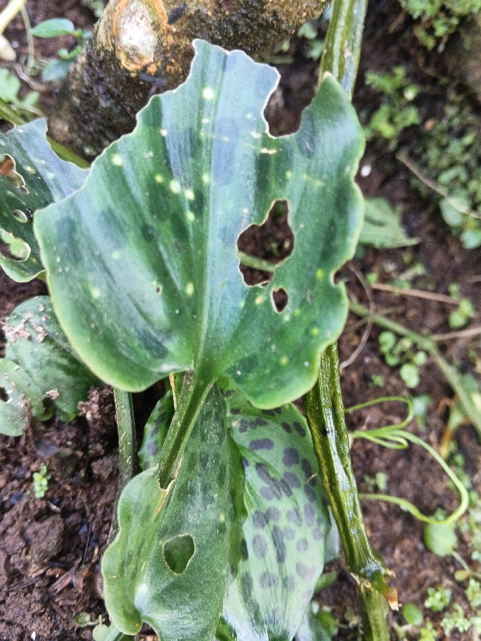 A plant with broad, green leaves, some having dark-colored spots, grows near the ground. The largest leaf has numerous holes and jagged edges. The background is dark soil with scattered small plants. A textured, possible tree root is visible above the large leaf. A green stem runs vertically through the image.