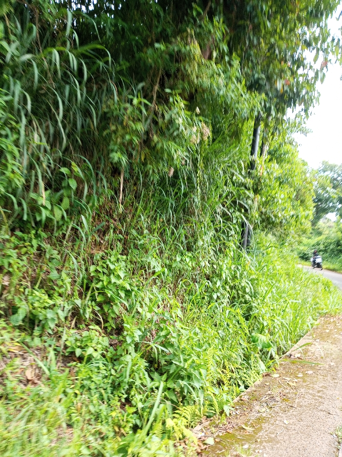 The image displays a roadside scene in Matale, Sri Lanka. The left and central portions are dominated by dense, varied green vegetation, including tall grasses, broad-leaved plants, and ferns, forming a natural embankment. A dark, paved road is visible on the right, extending diagonally into the background. A concrete or paved edge separates the vegetation from the road surface, which appears to have wet patches. A dark, vertical pole-like object is partially obscured by foliage in the mid-right. In the far distance on the road, a blurry figure riding a motorcycle or scooter is observed traveling away from the viewer. The scene is illuminated by natural daylight.