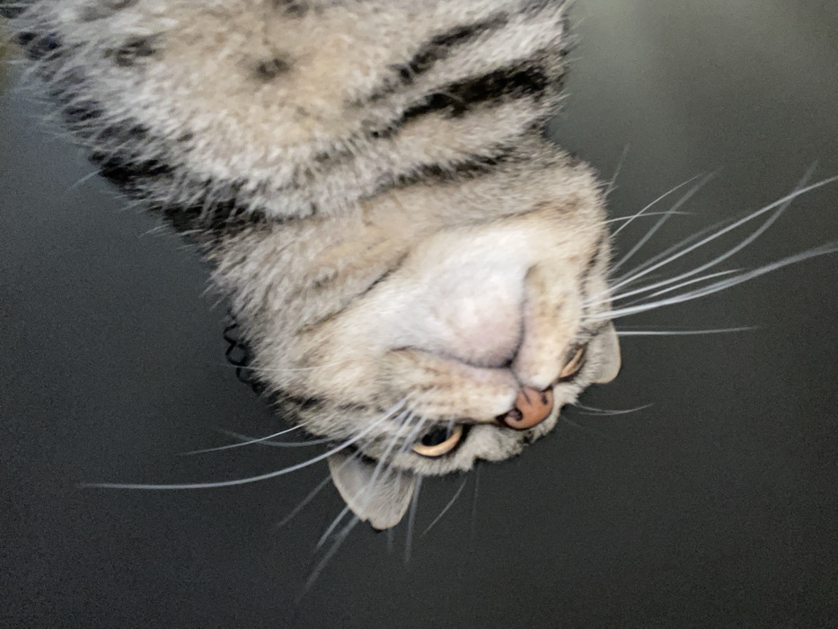 - "A domestic shorthair cat, exhibiting a tabby pattern with shades of light brown, grey, and black stripes, is depicted in a close-up, inverted portrait" by FM-qaxKg1, licensed under CC BY 4.0