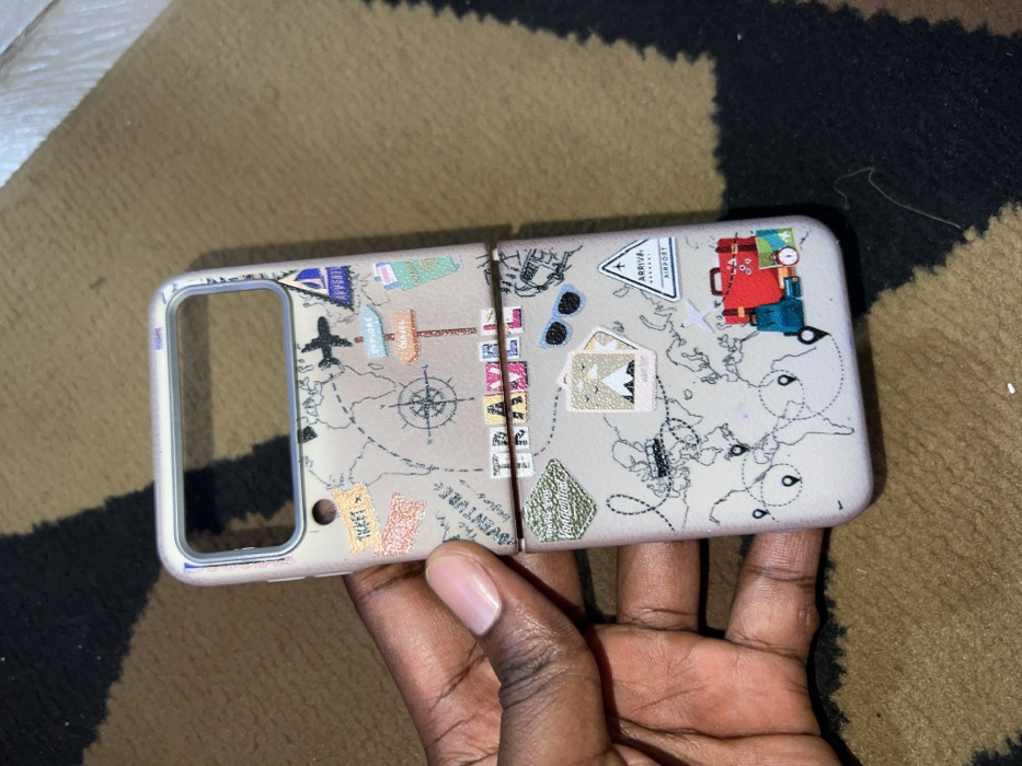 A phone case, designed for a foldable phone, is presented. It features a travel-themed design. The case is adorned with a pale map background, complemented by travel-related stickers such as airplanes, compasses, and luggage. The case is held in a person's hand, showcasing the design and structure.