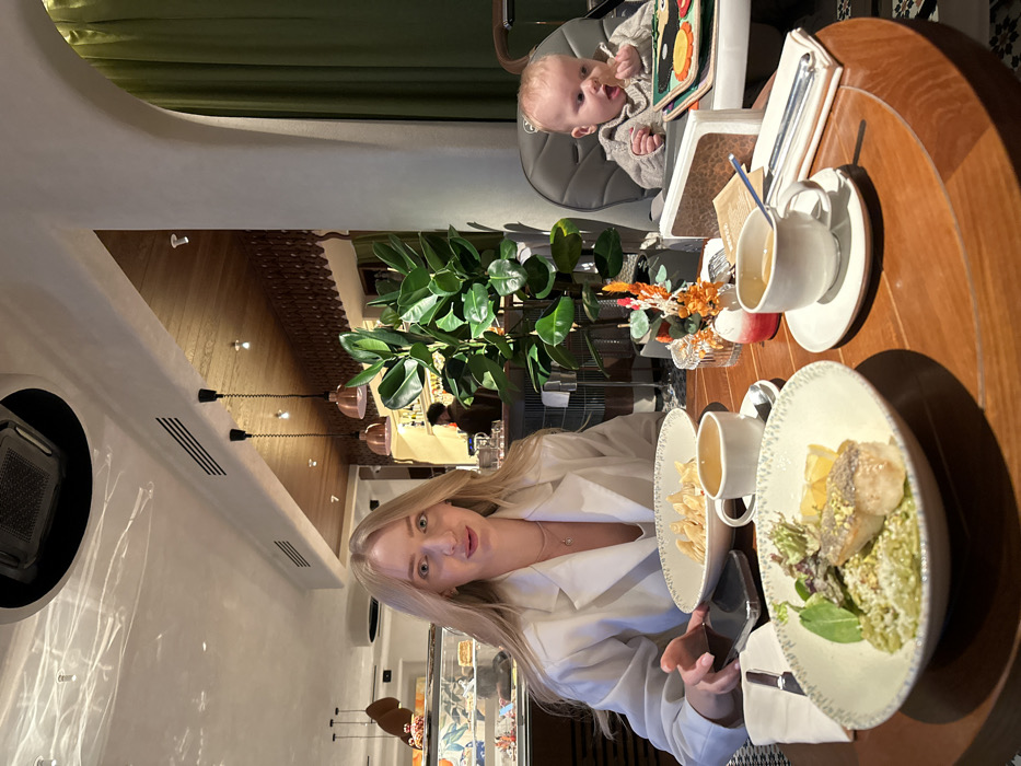 A blonde-haired woman, approximately 20-30 years old, wearing a light-colored blazer over a low-cut top and a necklace, is seated at a round wooden table in what is identified as the "Mokhovaya 7" restaurant at Mokhovaya Ulitsa, 7, Moscow, Russia. She looks directly at the camera with a neutral expression, her left hand resting on a dark-colored smartphone. In front of her is a white bowl containing pasta or dumplings. Closer to the foreground is another white bowl holding a dish with a fish fillet, green purée, lemon wedges, and salad greens. To her right, a baby with light hair, wearing a light-colored long-sleeved top, sits in a gray high chair. The baby holds a piece of food, possibly a cracker, in its right hand and looks to its left. An open children's activity book with colorful fabric elements is on the high chair's tray. Two white teacups with saucers are on the table, along with cutlery, a white napkin, a menu holder, and a small decorative arrangement featuring orange dried flowers and a red-orange candle. The background shows a contemporary restaurant interior. To the woman's left, a refrigerated display case holds various pastries and desserts. Behind the table and a large green potted plant, a bar area is visible with a male figure (presumably staff) behind it. The bar features a distinctive wooden ceiling with intricate decorative elements and copper-colored pendant lights. The restaurant's ceiling is light-colored with recessed lighting and visible air conditioning vents. White arched architectural features are present, with an archway on the right leading to an area with green curtains. The lighting is warm and artificial.