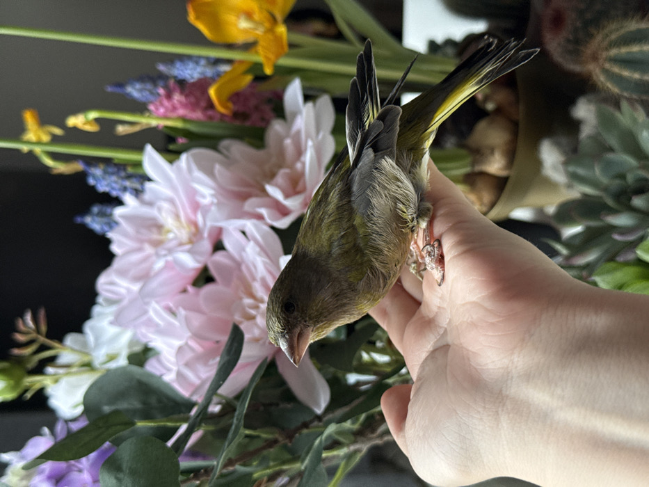 - "A European Greenfinch (Chloris chloris) with olive-green and yellow plumage, a conical beak, and dark eyes, is perched on the open, upturned palm of a light-skinned human left hand" by FM-NjEox2, licensed under CC BY 4.0