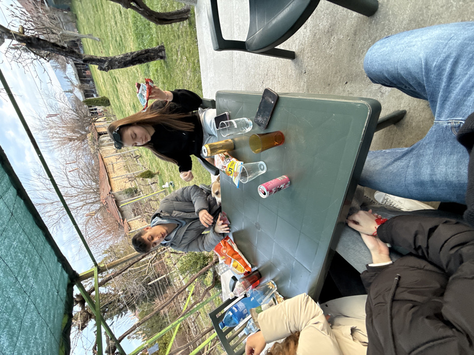 The image depicts an outdoor gathering of several individuals around a rectangular green plastic table on a concrete patio in Katunitsa, Bulgaria. A green mesh canopy provides shade overhead, supported by a metal framework. In the mid-ground, a young male wearing a light grey puffer jacket and a hoodie is seated on the left side of the table, looking downwards. A small, light-colored dog is partially visible beneath the table near him. Opposite, a young female with long brown hair, wearing a black hoodie and sunglasses perched on her head, is seated, holding a red and silver rectangular object in her left hand. Her gaze is directed towards the male. The table is cluttered with various items, including a blue plastic bottle of water, a red liquid bottle, an "Absolut" branded gold beverage can, a pink beverage can, several clear and one amber glass, an orange bag of chips with "HOT" visible text, and another snack bag. A black smartphone is placed face down on the table to the right. In the foreground, the legs of two individuals are visible beneath the table. One individual wears blue jeans, and another, partially visible, wears a black puffy jacket and light-colored sneakers. Their hands are clasped together under the table, with a red string bracelet visible on one wrist. The background reveals a rural or semi-rural landscape under a light cloudy sky. Bare deciduous trees and what appear to be pruned grapevines suggest a late winter or early spring setting. Several residential buildings with tiled roofs and a fence are visible in the distance. Hills or mountains are faintly discernible on the horizon. A black plastic chair is positioned to the right of the table on the patio.