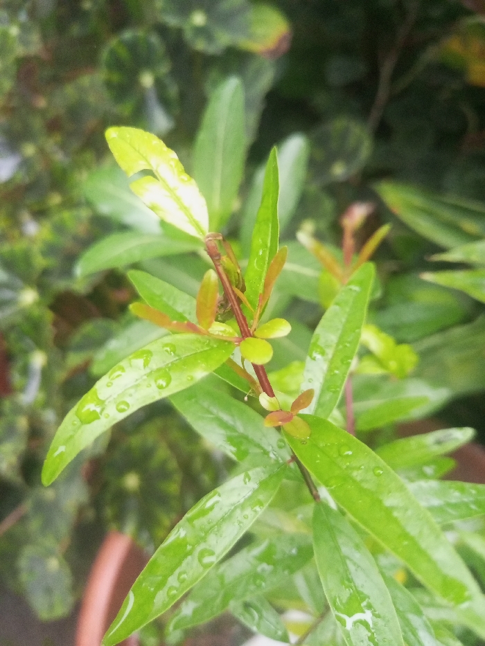 The image captures a close-up, vertical view of a plant branch with foliage, situated in the city of Zee Pin Kone, Myanmar. The central subject is a stem displaying multiple elongated, ovate leaves. These leaves range in color from a vibrant light green, particularly for newer growth, to a deeper medium green for more mature leaves. Numerous small, clear water droplets are visible resting on the surfaces of many leaves, indicating recent moisture. The uppermost prominent leaf, light green in hue, exhibits an irregular tear or hole near its upper edge. The main stem of the plant is a reddish-brown color, from which leaves and smaller offshoots with emerging lighter green and reddish-tinged nascent leaves sprout. The background is composed of blurred, out-of-focus green foliage, suggesting other plants or dense vegetation, with a partial view of a terracotta-colored pot visible in the lower left section. No individuals, animals, or significant actions are depicted. The scene is static, under diffused lighting conditions.