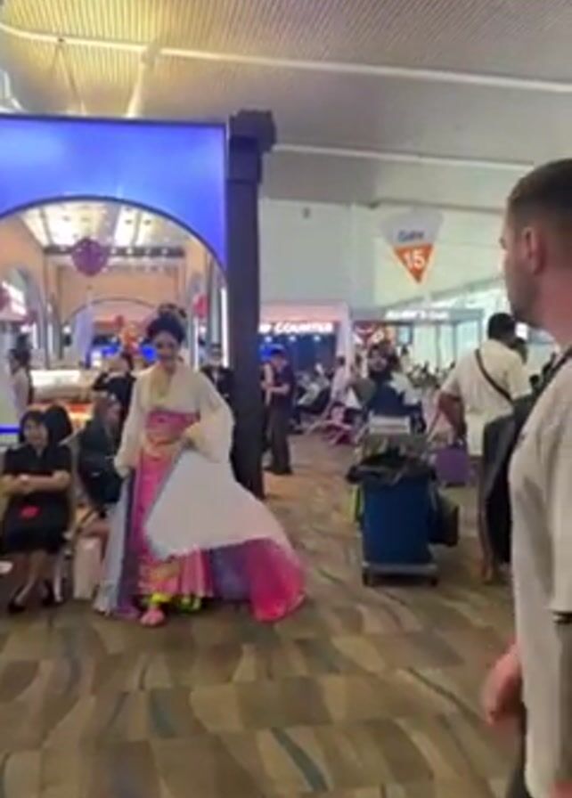 person wearing a traditional Chinese gown, walking in an airport. The gown is mainly pink, white, and light blue. The person wears makeup and an elaborate headdress. Other people are visible in the background, mostly seated, waiting, or passing by. A cleaning staff member pushes a cleaning cart in the same area. Airport gates and signs are visible, indicating this is likely an international airport. The floor has a patterned carpet.