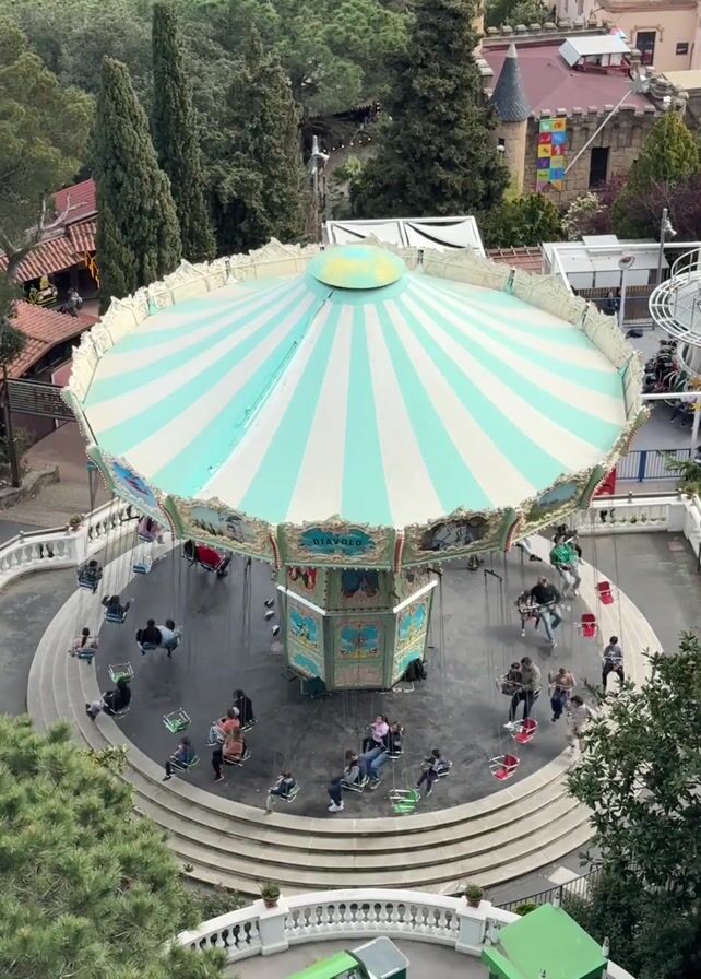 n aerial view of a swing carousel, occupied by numerous individuals, in operation at what appears to be an amusement park. The carousel has a white and teal striped canopy. The individuals on the ride are seated and swinging in a circular motion. In the background, there are trees and structures that resemble small castles. As the camera pans out, it reveals a cityscape stretching to the horizon. The environment is outdoor, and the video seems to have been taken during the day.