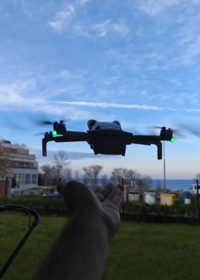 - "A hand holds a small grey drone with rotating propellers and green lights on two arms against a backdrop of green grass and buildings" by FM-Hxjuj2, licensed under CC BY 4.0