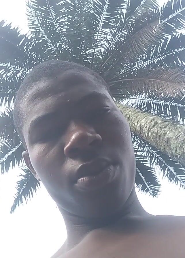 The video is a low-angle close-up of a shirtless person with dark skin, positioned in front of a tall palm tree