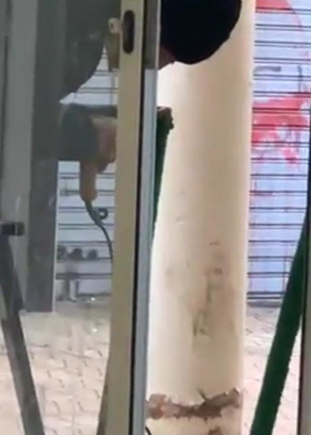 person wearing a black beanie working in an apparently damaged commercial space. The person is cutting a piece of green material with a power tool, visible through a glass door that is partially open. The background includes a pillar, a closed shutter with graffiti, and cleaning equipment. The floor is littered with debris.