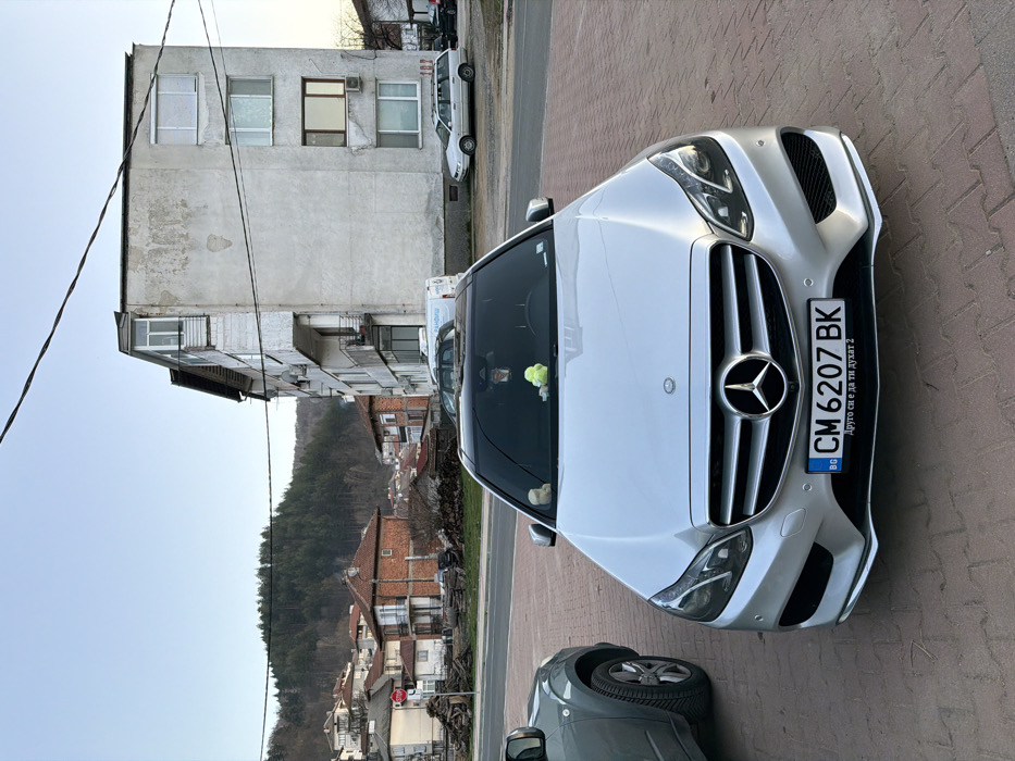 The image displays an urban street scene in Zlatograd, Smolyan Province, Bulgaria, under a clear, bright sky. A silver Mercedes-Benz E-Class sedan, bearing Bulgarian license plate CM 6207 BK and text "Друго си е да ти духат 2" below it, is parked on reddish-brown interlocking pavers in the foreground, facing directly towards the viewer. Several small stuffed figures are visible on the vehicle's dashboard. A grey SUV is partially visible parked to the Mercedes's left. Behind the foreground vehicles, a two-lane asphalt road runs horizontally across the scene. To the left of the road, a red hexagonal stop sign is visible near a large pile of cut wood or logs. In the midground, a five-story, weathered light-colored residential building with multiple windows, balconies (one enclosed), and external air conditioning units stands prominently to the right. A white commercial van with "РАНФИШИ" written in Cyrillic is parked in front of this building, and a white station wagon is parked further right. In the background, a residential area with numerous smaller houses featuring red-tiled roofs and various facades extends up a gentle hillside to the left. This area transitions into a densely forested hill that dominates the left-side background. A single dark utility wire stretches diagonally across the upper portion of the frame. No individuals are present in the scene, and no actions are depicted.