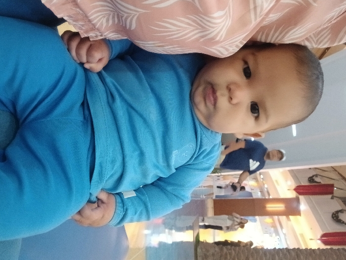 A baby in blue attire is held in someone's arms, gazing directly at the camera with a curious expression. The person holding the baby is wearing a peach colored blouse with white floral designs. In the background, a man in a navy blue shirt can be seen. The location appears to be a public space, with visible structures resembling commercial or public buildings.
