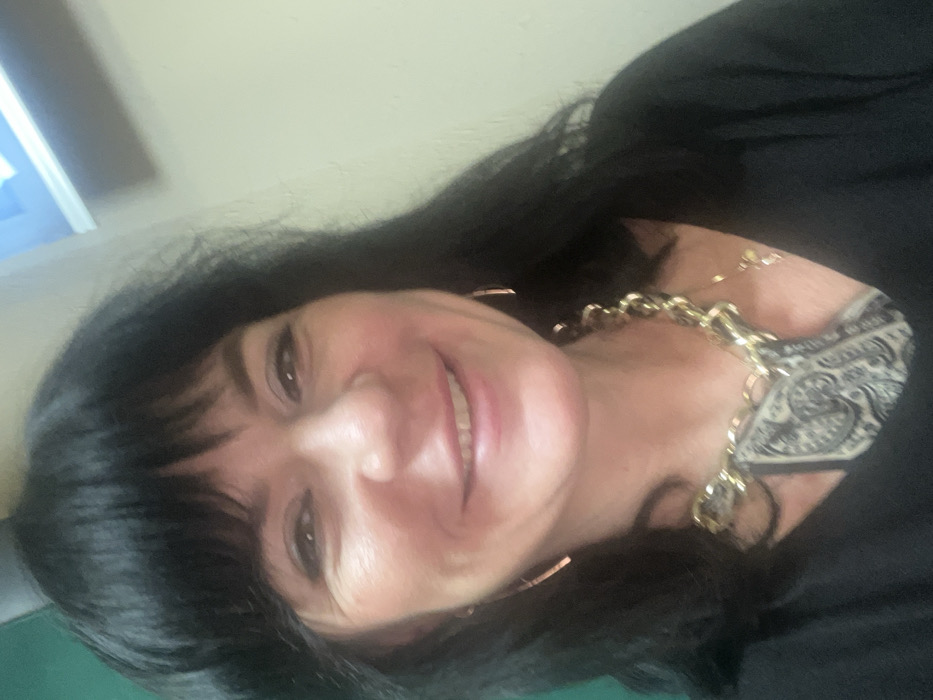 A woman with dark hair and bangs smiles at the camera. She's wearing a black top and a chunky gold chain necklace. Her earrings are simple gold hoops. The background appears to be an indoor setting with a neutral wall. Part of a window frame is visible in the upper left corner.
