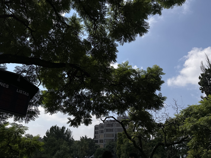 The image displays an outdoor urban environment in Mexico City, Mexico, viewed upwards through a dense tree canopy during daylight hours