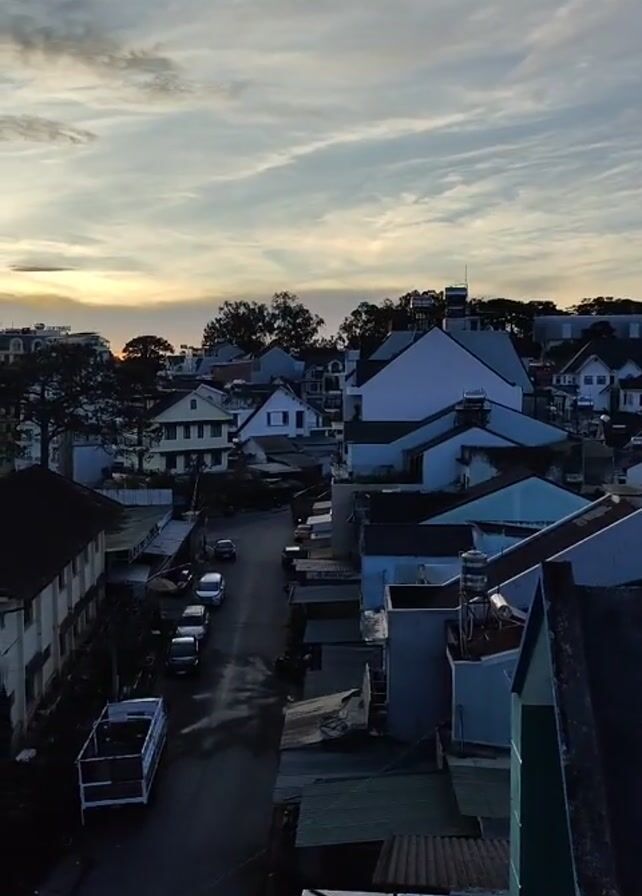 n aerial view of a street in a residential area at dawn or dusk. The sky is a mix of grey, white, and orange from the setting or rising sun. There are houses on either side of the street, most with white or light-colored walls and dark roofs. Several cars are parked along the street, and a truck is visible in the foreground. The street appears to be slightly wet, possibly from recent rain. Trees are interspersed among the buildings. The overall scene is quiet and peaceful.