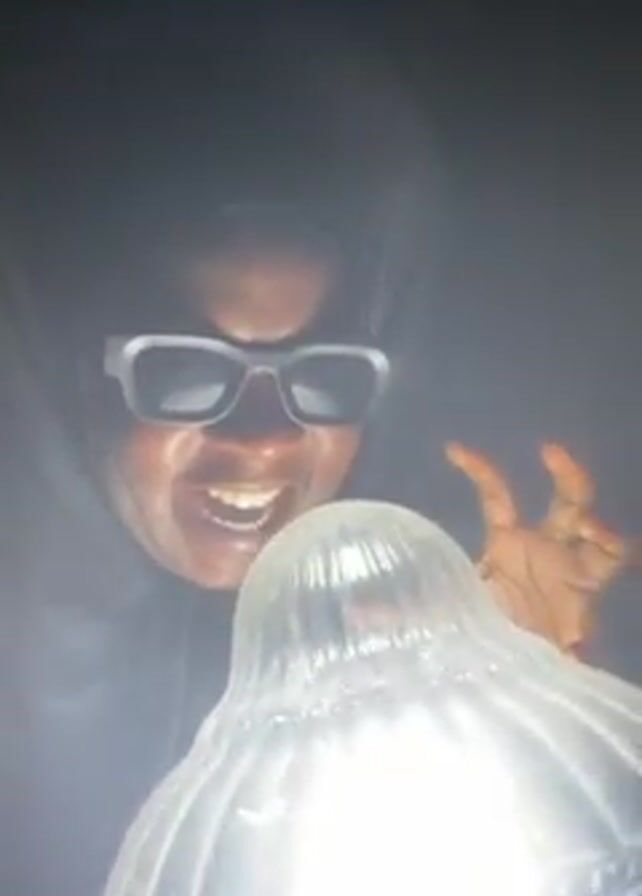 A dark-skinned individual wearing black sunglasses and a dark hooded garment is shown in a dark environment, illuminated by a translucent, white, mushroom-shaped lamp that they are holding