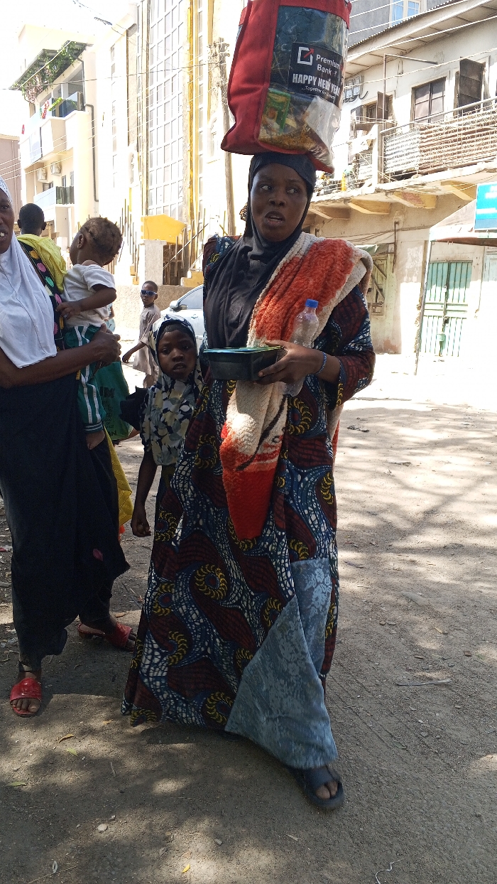 This image depicts a street scene in Sabon Gari East, Nigeria. In the foreground, an adult female with a black head covering and a patterned dress carries a red bag, bearing "Premium Bank" and "HAPPY NEW YEAR" text, balanced on her head. She holds a small black container and a plastic water bottle in her left hand. Adjacent to her, a young girl in a patterned headscarf looks towards the viewer. To the far left, a partially visible adult female, wearing a white head covering and red sandals, carries a small child. Further back, a young boy in a light shirt and sunglasses is visible. The ground is unpaved dirt. The background features a modern, multi-story, light-colored building with balconies on the left, and older structures, one with a green metal gate, on the right. The scene is illuminated by strong daylight, casting shadows on the ground.