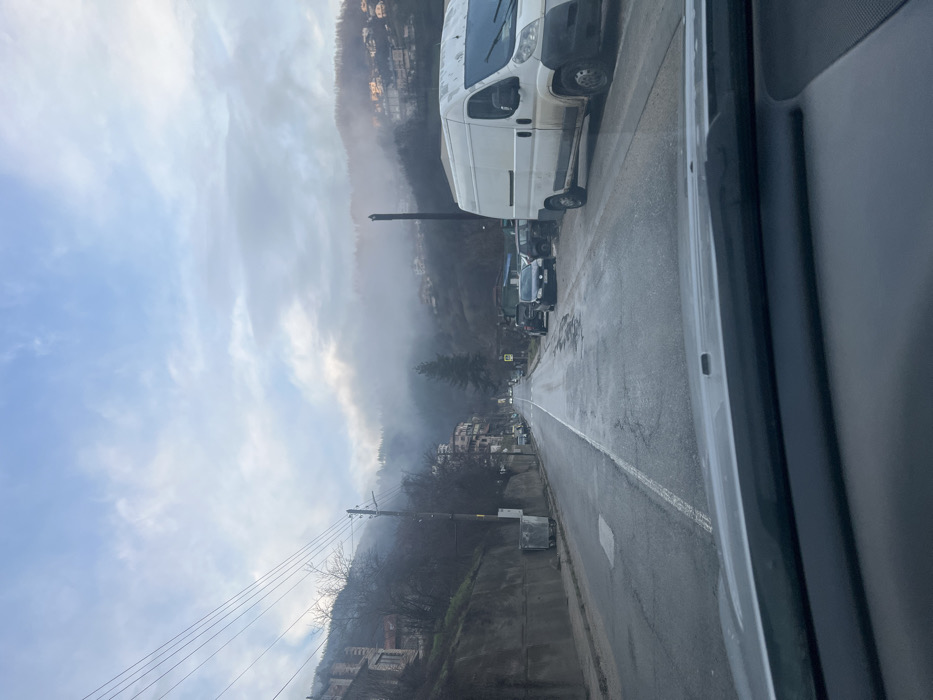 The image depicts a wet asphalt road traversing a mountainous or hilly landscape in Vlahovo, Bulgaria, viewed from inside a vehicle with its dashboard visible in the foreground. The road extends straight into the distance, marked by a faded single white line. On the left, a concrete retaining wall parallels the road, above which a steep hillside with mostly bare deciduous trees and some evergreen foliage rises. Scattered residential buildings with stone and stucco facades are visible on this slope, alongside utility poles carrying multiple overhead wires. A large, rectangular galvanized metal dumpster is situated near the retaining wall. On the right side of the road, a white panel van, appearing dirty, is parked facing away from the camera. Behind it, several other vehicles, including a dark hatchback and an SUV, are parked. A yellow road sign is visible further down the road on this side. Another steep, tree-covered hillside rises on the right, partially obscured by low-lying mist or fog. Residential structures are visible on this hillside, with some appearing to catch diffuse light through the mist. The sky above is partially cloudy with patches of blue and grey, and the upper portions of the hills are enveloped in mist, suggesting a damp or cool environment. No people, discernible actions, or interactions are visible.