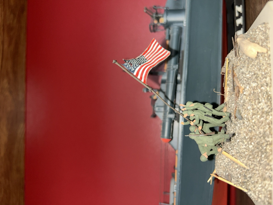 This image, captured in Truchtersheim, France, displays a miniature diorama positioned in front of a larger model ship. The diorama features six olive-drab clad miniature military figures engaged in raising an American flag on a thin, dark flagpole. Five figures are actively holding and manipulating the pole, while the sixth stands to the left. The diorama base is covered with fine, light-colored granular material, interspersed with small brown debris and a single light tan, irregularly shaped object on the right. Behind the diorama, a dark gray/blue model naval vessel is partially visible, featuring a prominent gun turret with an orange muzzle cap and other superstructure details. The numbers "117" are discernible on the lower right side of the ship model. The entire arrangement is set against a plain, solid red background, with a strip of dark brown wood visible at the top edge of the frame. The diorama rests on a white base, a portion of which is visible at the bottom right.
