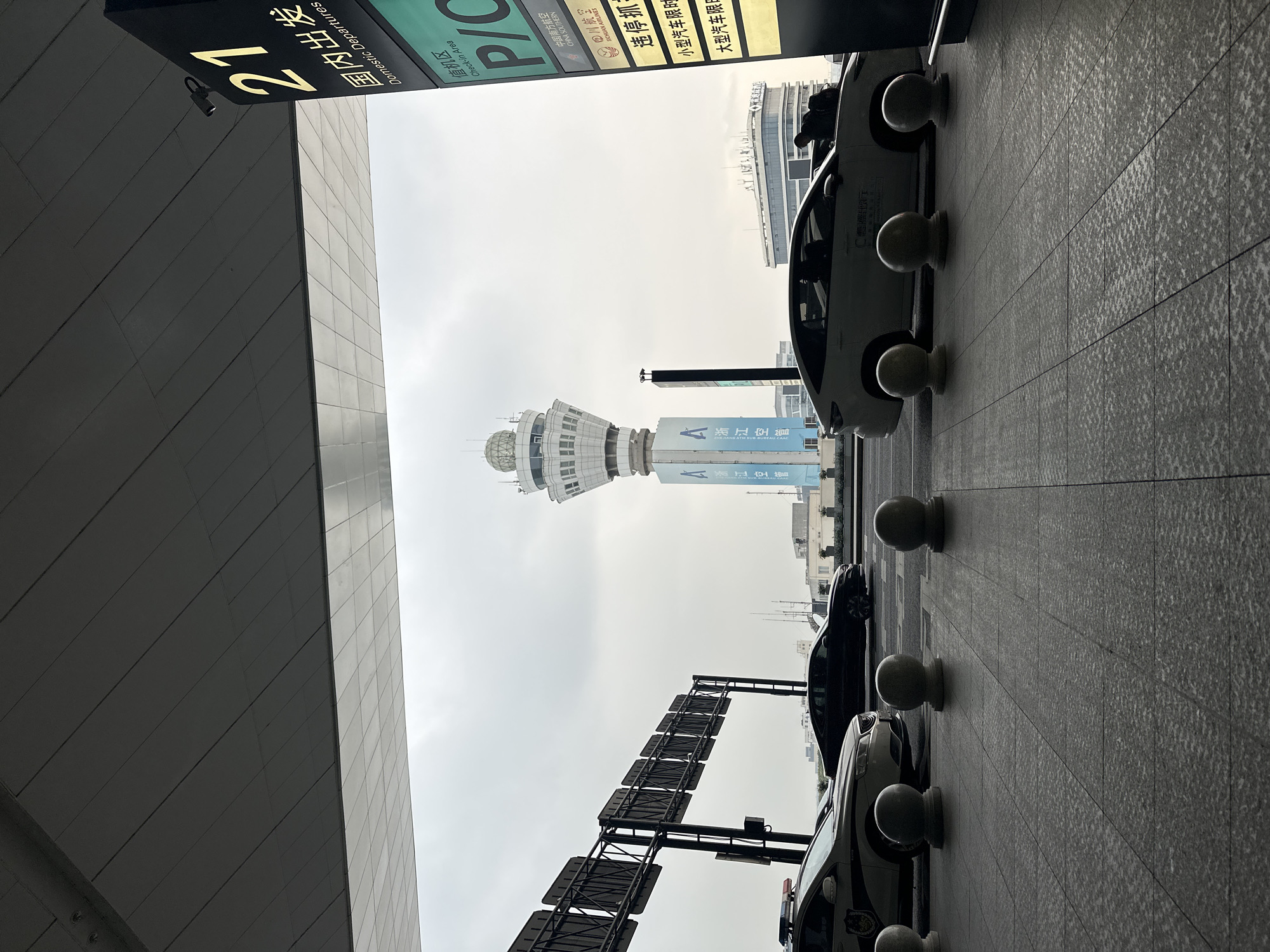 The image depicts an outdoor airport scene under an overcast sky, viewed from beneath a gray paneled overhead canopy. The location is Hangzhou Xiaoshan International Airport, situated in Xiaoshan District, China, identifiable by the control tower and Chinese signage for "Domestic Departures" and "Zhejiang Air Traffic Management." In the foreground, a textured gray tiled surface, consistent with a pedestrian walkway, is visible. Three light-colored, spherical bollards are evenly spaced along the edge of this walkway, separating it from a vehicle lane. On the roadway, from left to right, a light-colored sedan, possibly a police vehicle, is partially visible with a light bar on its roof and a shield-like emblem on the front passenger door. Behind it, a dark-colored sedan proceeds or is stationary. To the right of the bollards, a white sedan is stopped. One individual is discernible near the front passenger door of the white sedan, possibly engaging with the door or vehicle interior. Above the roadway, a horizontal structure supports multiple dark, rectangular signs. In the background, a prominent white and gray airport control tower with a dome-shaped top stands centrally, featuring a blue banner at its base displaying Chinese characters "浙江空管" (Zhejiang Air Traffic Management) and the letter "A". To the right, a tall, dark vertical signpost with illuminated yellow number "21" and white Chinese characters "国内出发" (Domestic Departures) and "Check-in Area" provides directional information, also listing "中国南方航空" (China Southern Airlines), "四川航空" (Sichuan Airlines), and parking restrictions for small and large vehicles. Additional airport buildings are visible on the horizon under the uniform gray sky.
