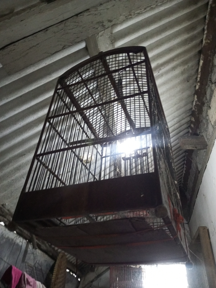 - "A weathered birdcage hangs from a slanted, corrugated ceiling" by FM-ACnjY2, licensed under CC BY 4.0