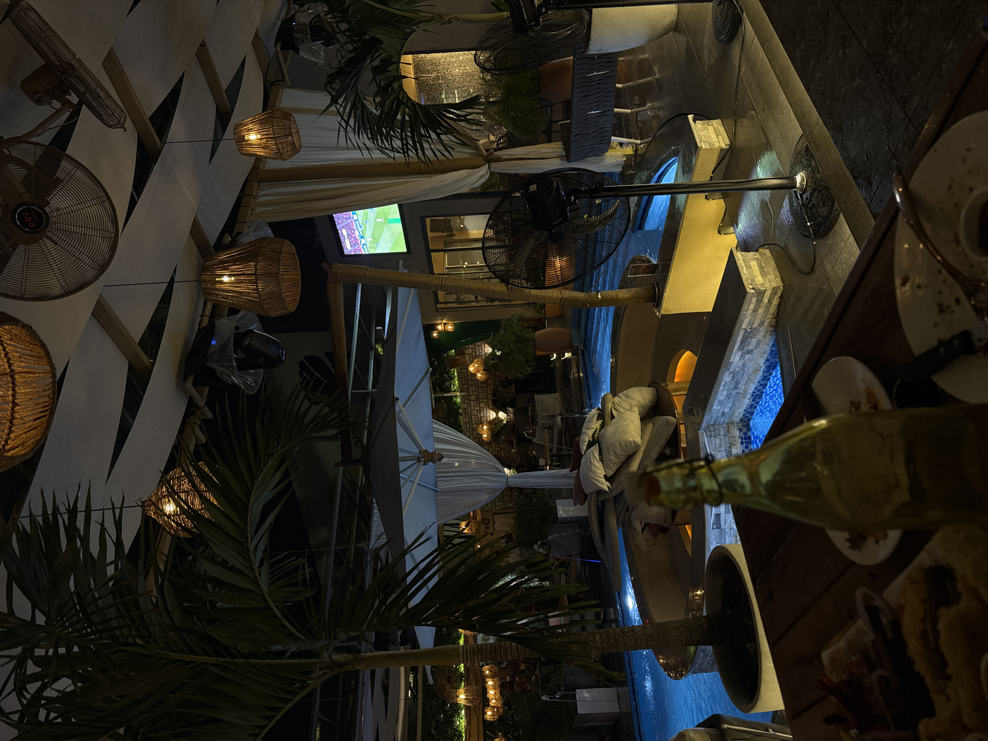 The image depicts an outdoor dining area at night. Wicker lamps hang from the ceiling. Palm trees are visible throughout the scene. There is a swimming pool adjacent to the dining area. A television screen displays a sporting event. People are seated on lounge chairs. Dishes are on the table. A bottle is on the table. There is no indication of the specific location in Itirin, Nigeria.