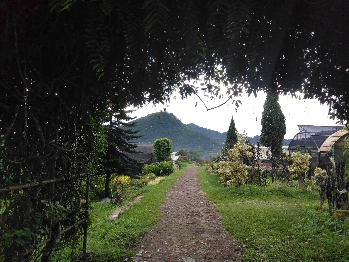This image depicts a narrow, unpaved path extending into the distance, framed by dark, dense foliage overhead and along the left