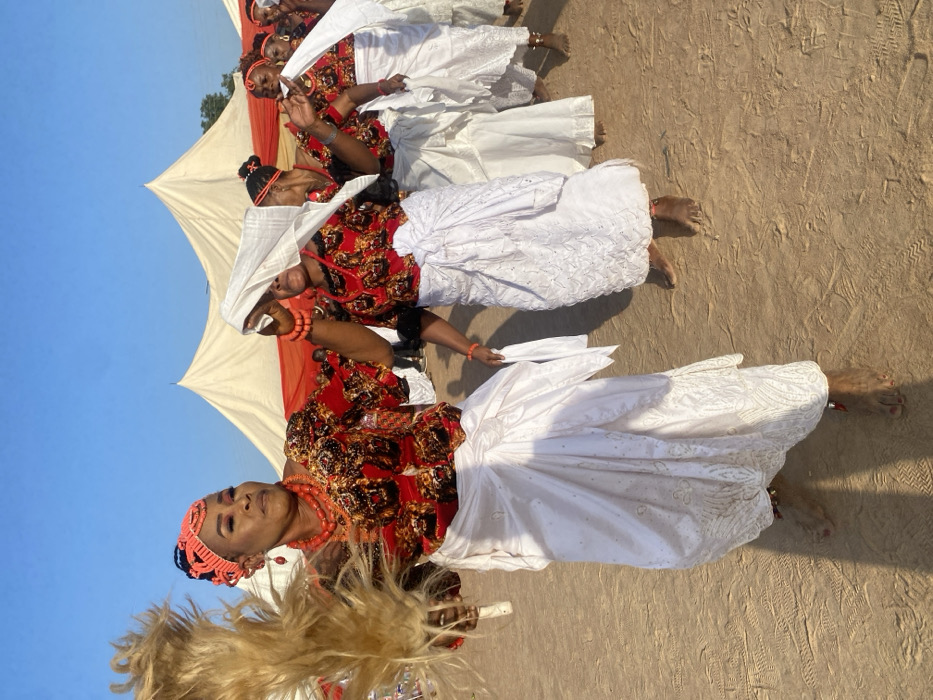 The image depicts an outdoor cultural event in Barden Yana, Nigeria, featuring multiple women engaged in a procession or performance. The women wear matching attire: red and black patterned blouses, white embroidered or lace wrappers, and extensive red beaded jewelry including necklaces, bracelets, earrings, and headpieces. They are barefoot on sandy ground, with red ankle ornaments visible on some. In the foreground, one woman holds a large, light brown feathered fan in her right hand, while another woman to her right raises a white cloth over her head. Several more women in similar dress follow. The background features large white tents draped with red fabric, set against a clear blue sky.
